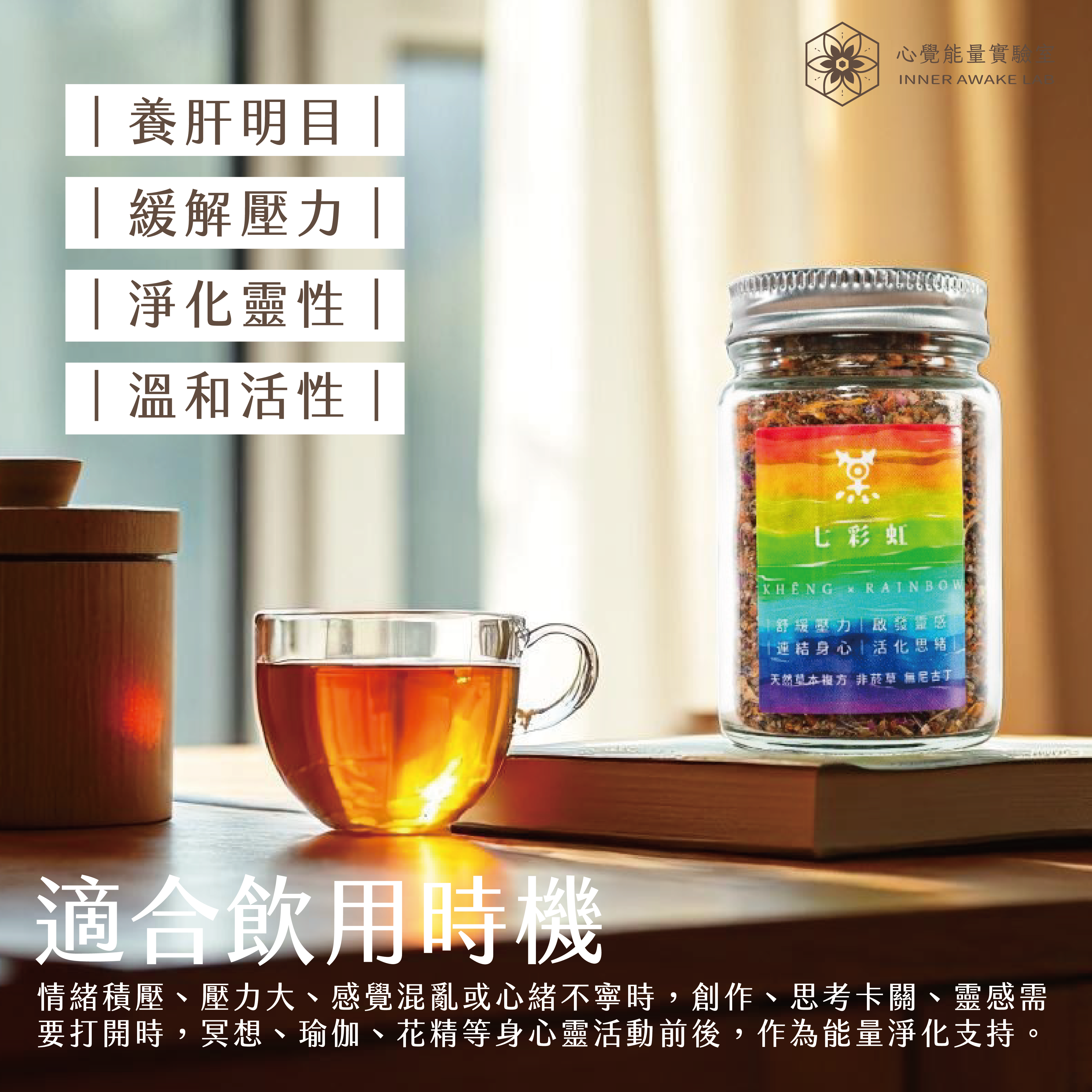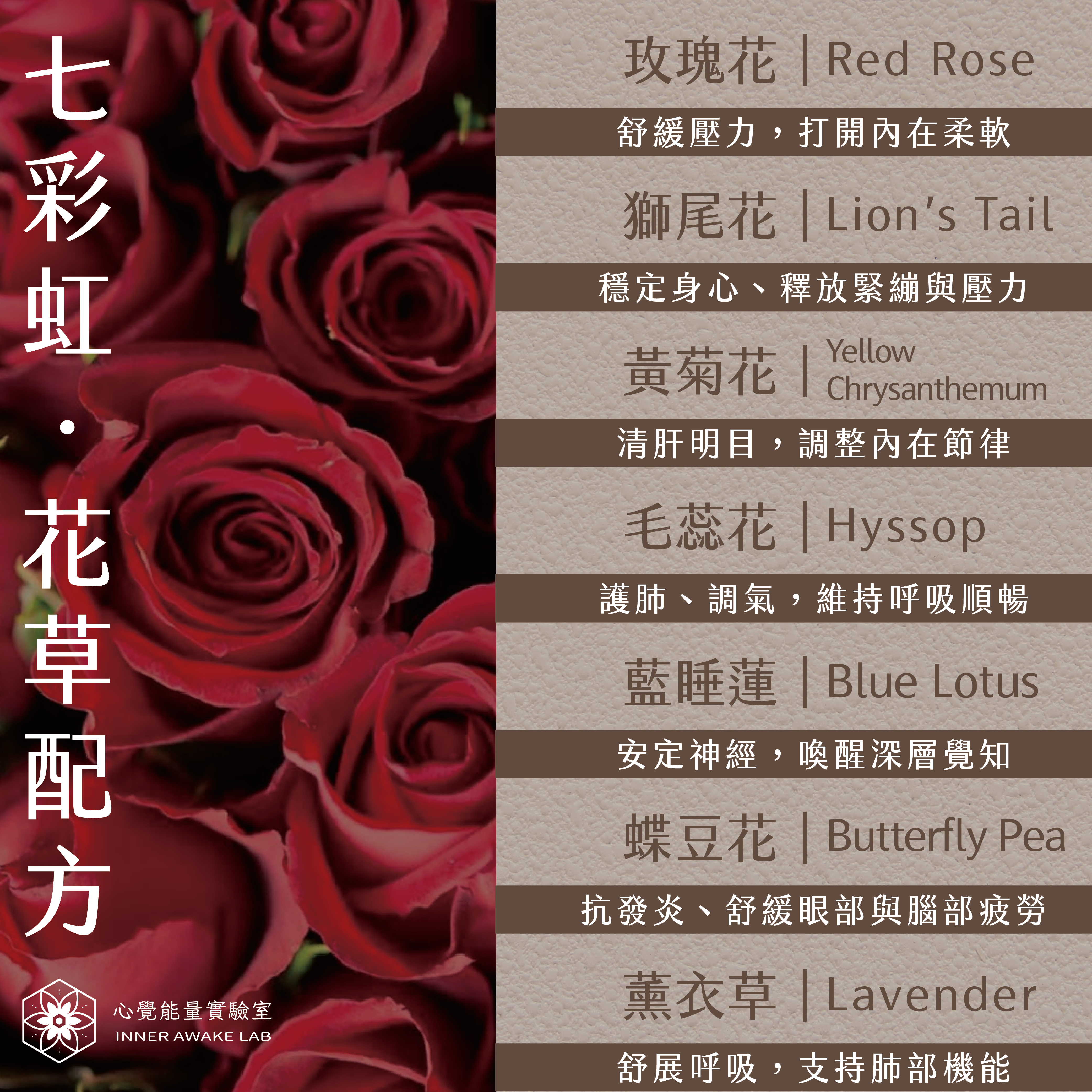 七彩虹配方融合七種色彩與對應花草,從視覺到味覺都富含清新、平衡與靈性感受。它能協助舒緩壓力、安撫情緒、促進循環與代謝,讓你在平凡的日常中,也能體會一點清透與輕盈。