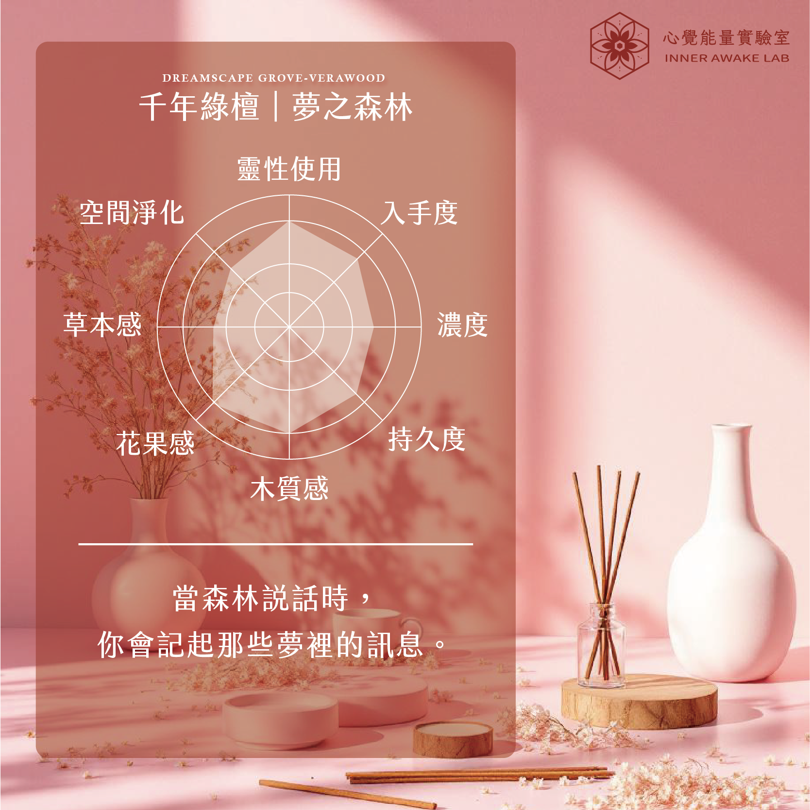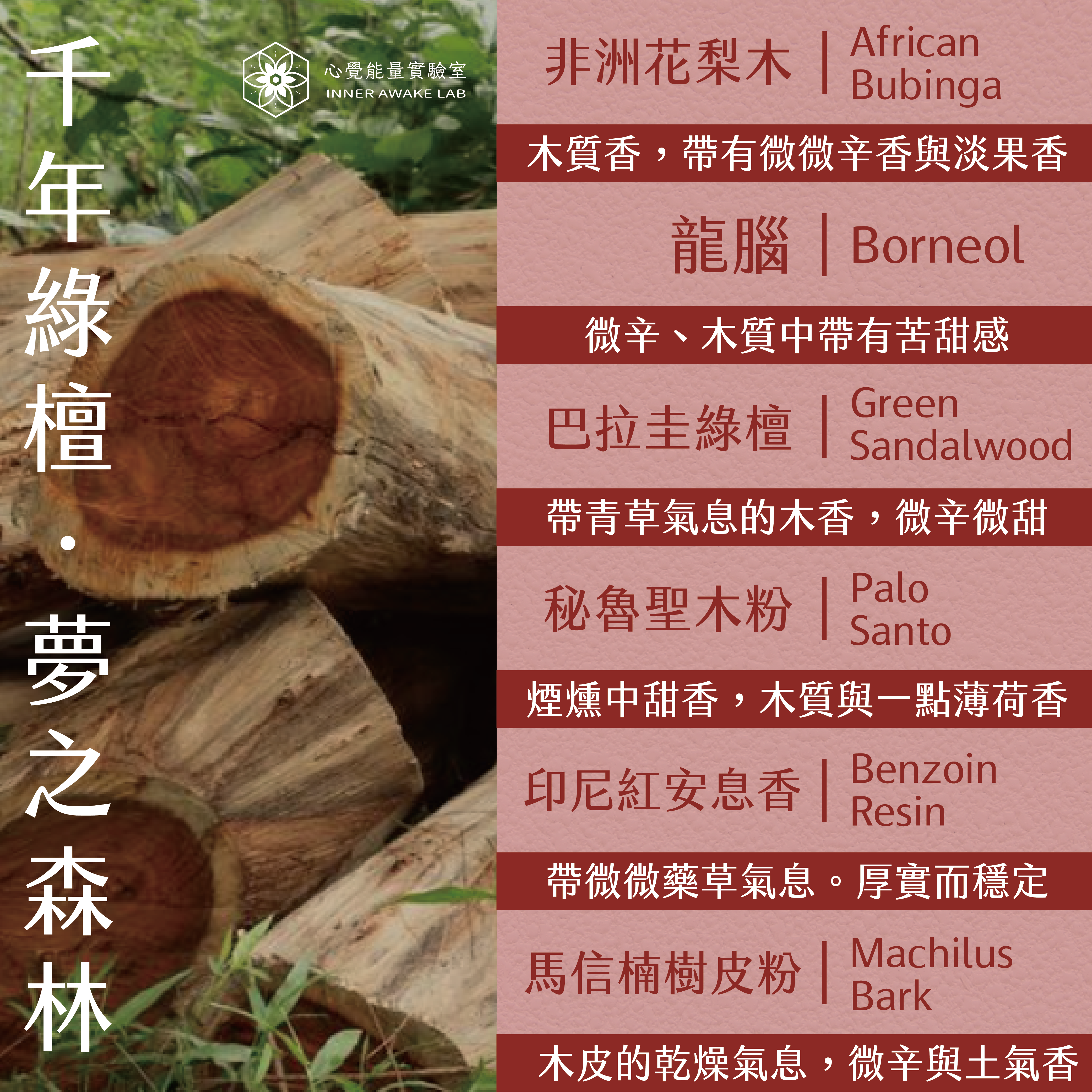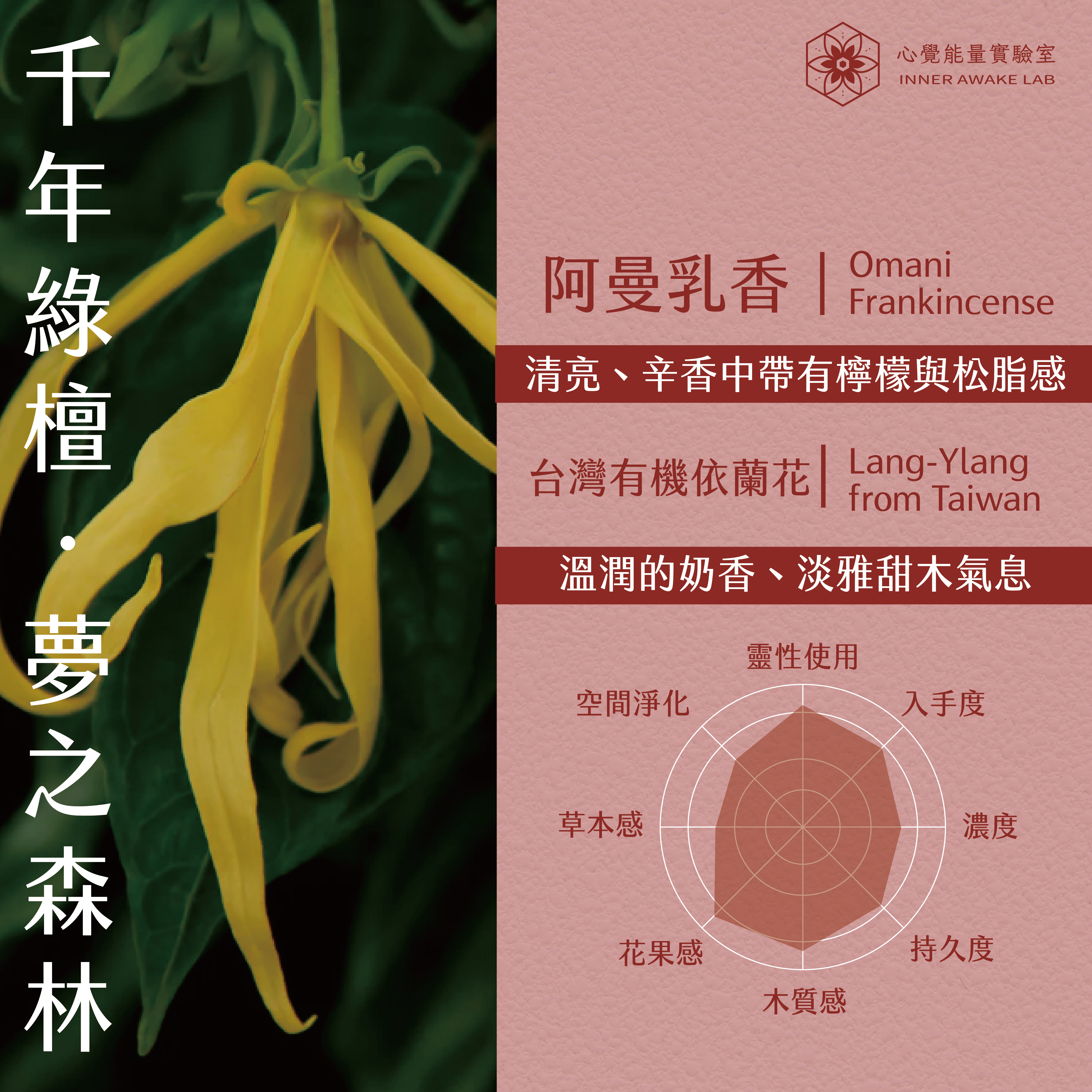 夢之森林,融合百年熟成非洲花梨木、千年巴拉圭綠檀、老阿曼皇家乳香與台灣自然乾燥的有機依蘭花,細緻溫潤,交織出一場輕盈卻深邃的嗅覺之舞,如精靈在樹間遊走,點亮一片光點,帶來輕巧雀躍的愉悅感。