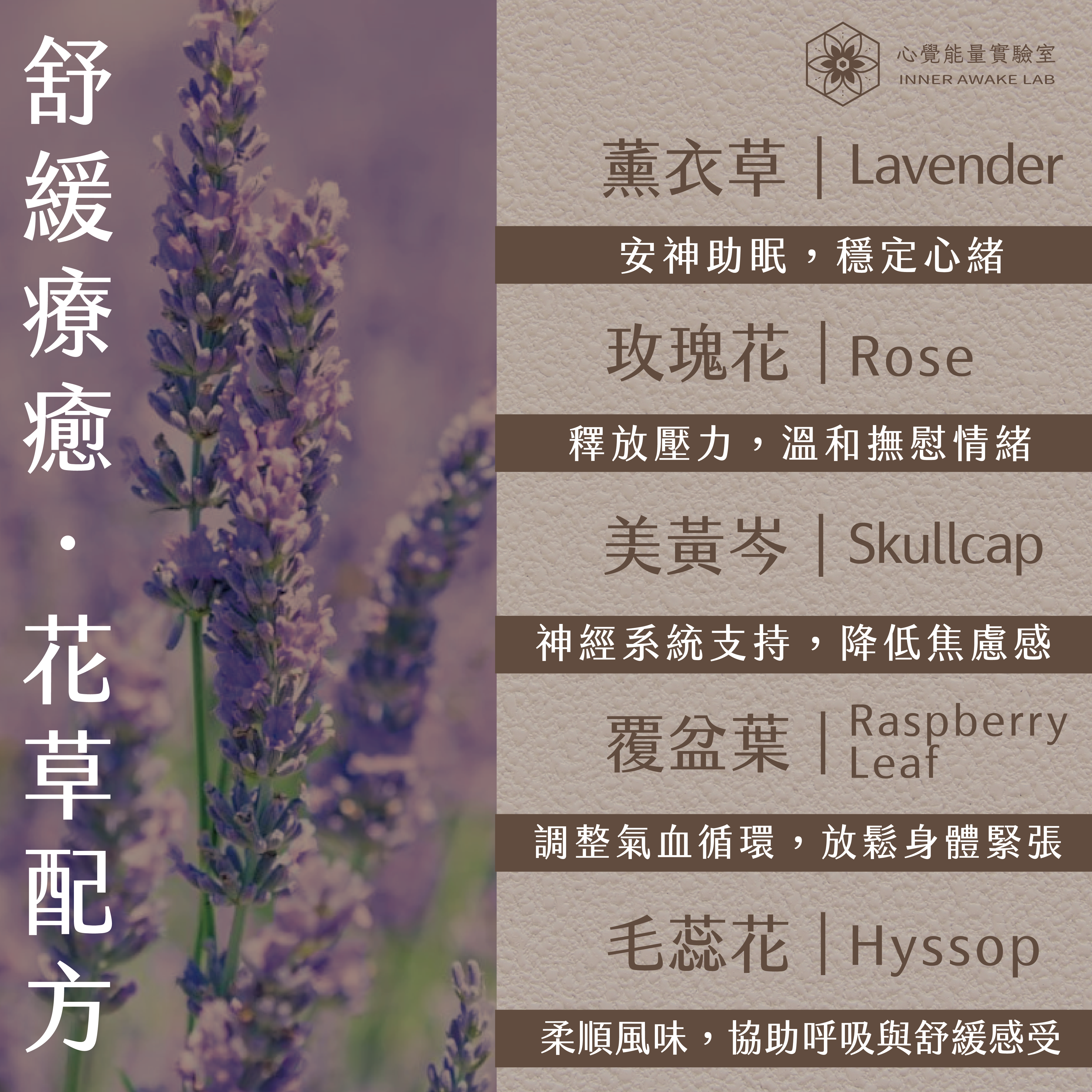 舒緩療癒配方選用多種具有安神、放鬆功效的花草,幫助你從緊繃與疲憊中慢慢釋放。花香柔和而濃郁,喝下的那一刻,彷彿身心都沉入寧靜深處。