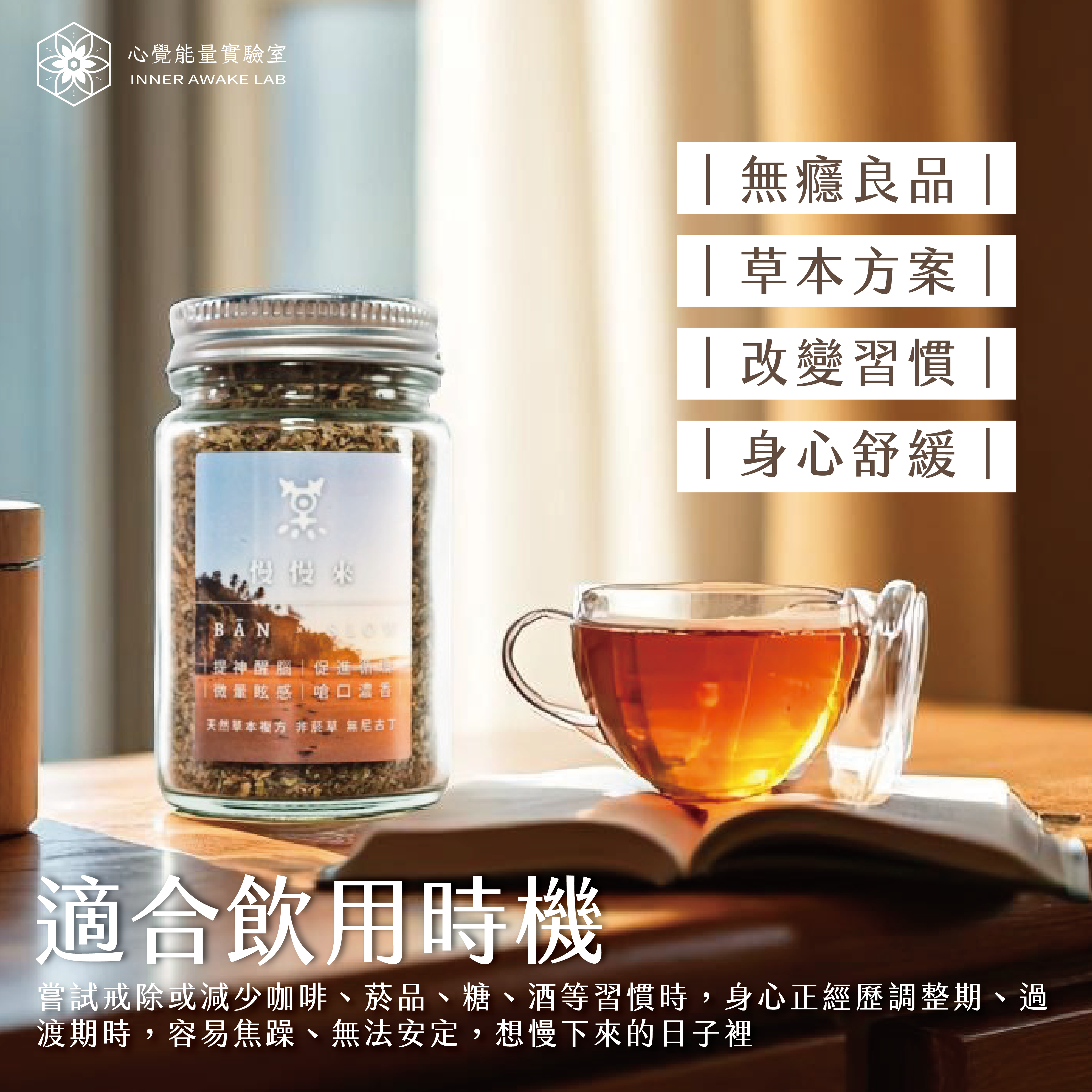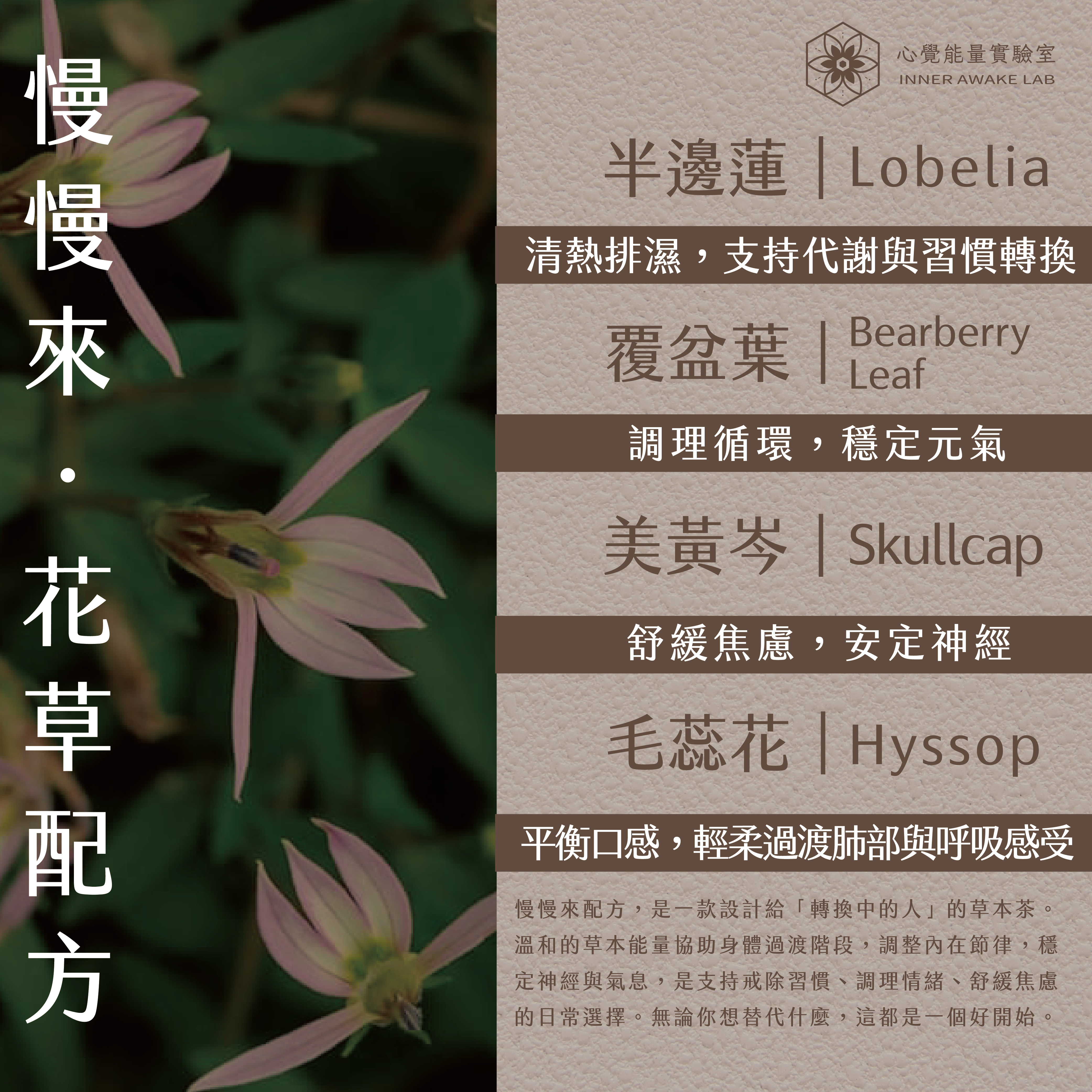 慢慢來配方,是一款設計給「轉換中的人」的草本茶。溫和的草本能量協助身體過渡階段,調整內在節律,穩定神經與氣息,是支持戒除習慣、調理情緒、舒緩焦慮的日常選擇。