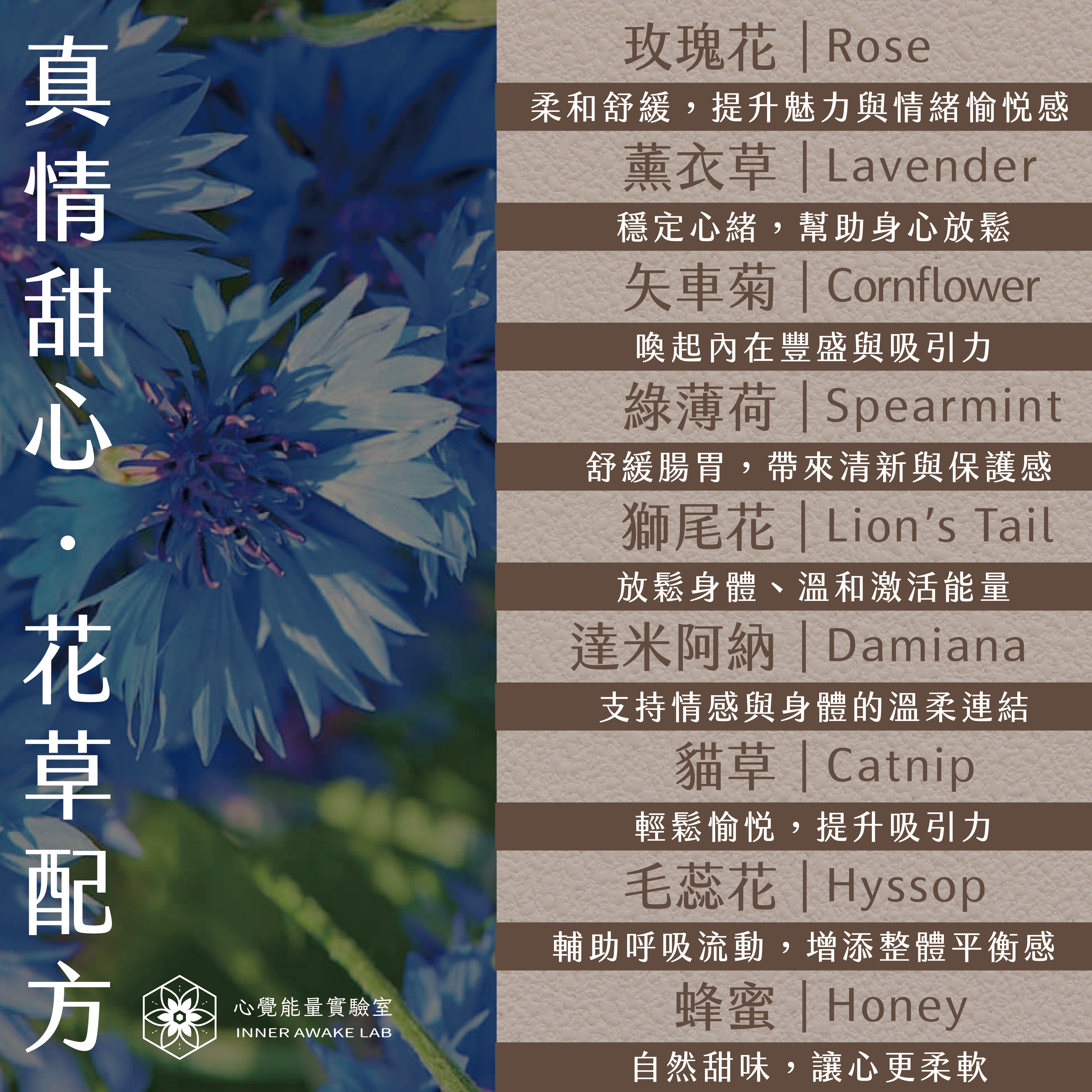 真情甜心配方結合玫瑰、薰衣草與多種溫和放鬆的花草,幫助你在情緒中穩定下來,在關係中保持溫暖與真誠。甜潤花香輕盈不膩,適合每一次想好好對待自己的時刻。