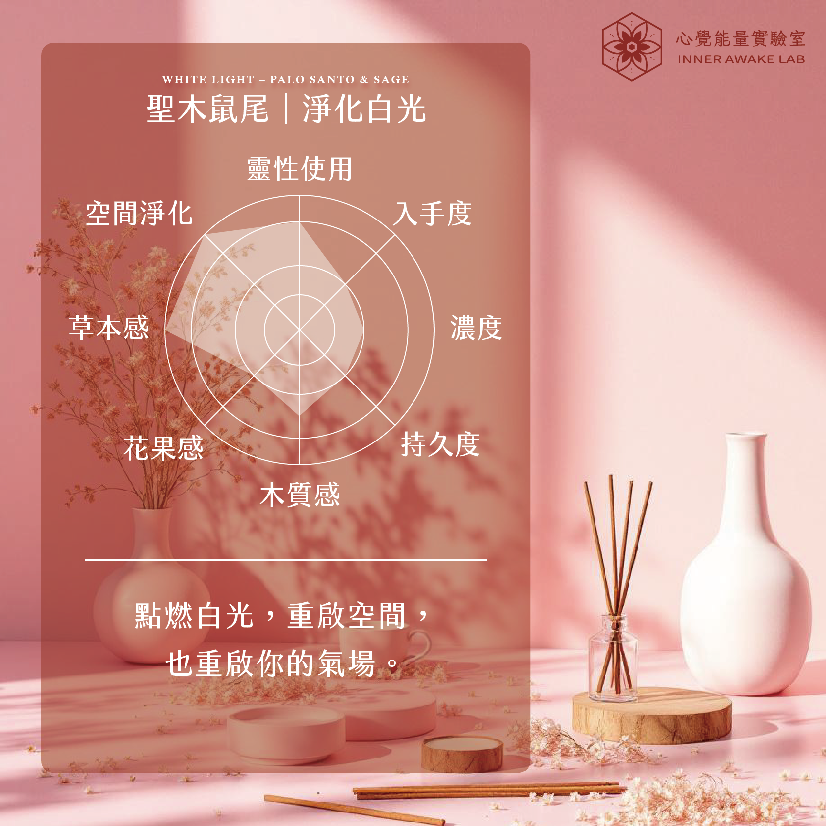 淨化白光,燃起一縷香,讓草本與木質交織的氣息緩緩流動,如一道純粹的光,提升空間與內在的頻率。